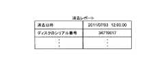 図4に示す消去レポートは,消去レポート送信部15によって生成され,端末管理サーバ30に送信される消去レポートの一例である。消去レポートは,データの消去を端末管理サーバ30に通知する情報である。図4に示す消去レポートは,消去日時,ディスクのシリアル番号等の情報を持つ。消去日時は,データ消去を行った日時を示す。ディスクのシリアル番号は,データ消去を行った記憶装置のシリアル番号を示す。  The erasure report shown in FIG. 4 is an example of an erasure report generated by the erasure