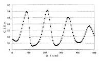 図3に示すように、発光効率ηの曲線は、その振幅が減衰しながら、ある値に収束していくことが分かる。以下、この値を輝度収束値と呼ぶ。これは、発光材料のフォトルミネッセンス(以下、PLと略す)が、ある半値幅をもつことに由来する。つまり、半値幅=ゼロであり、PLがインパルス関数(ディラックのデルタ関数)のようであれば、有機EL素子の発光効率ηの曲線が減衰することはない。しかし、実際には自然界にそのようなPLをもつ発光材料は見つかっておらず、有機EL素子から取り出される光の主なスペクトルのピークと、それに隣接するスペクトルが干渉し合い、互いに弱め合う。したがって、発光効率ηの曲線の高次の極値ほど、その絶対値が小さい。 As shown in FIG. 3, it can be seen that the curve of the luminous efficiency η converges to a certain value while the amplitude is attenuated. Hereinafter, this value is referred to as a luminance convergence value. This is because the photoluminescence of the light emitting material (hereinafter abbreviated as PL) has a certain half width. That is, if the half-value width is zero and PL is like an impulse function (Dirac delta function), the curve of the luminous efficiency η of the organic EL element will not be attenuated. However, in fact, no light emitting material having such a PL in nature has been found, and the main spectrum peak of light extracted from the organic EL element interferes with the spectrum adjacent to it and weakens each other. Therefore, the absolute value of the higher-order extreme value of the luminous efficiency η curve is smaller.