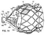 図13および14に最もよく示すように、弁保持機構114は、内側フォーク138、および外側フォーク140を含む。内側フォーク138は、ステント12の保持アーム30に対応する、複数(図示した実施形態において3つ)の角度離間した突起部142を含み、その突起部は、内側フォークの近位端において、ヘッド部分144から延在する。外側フォーク140は、同様に、ステント12の保持アーム30に対応する、複数(図示した実施形態において3つ)の角度離間した突起部146を含み、その突起部は、外側フォークの近位端においてヘッド部分148から延在する。  As best shown in FIGS. 13 and 14, the