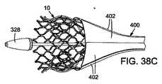 上述のように、回収デバイス400を使用して、完全に拡張した弁を回収し、それを患者の体内から除去することができる。図38Aに示すように、使用中、回収デバイス400は、カテーテルシャフト304の上を通って体内に挿入され、配備された弁10に向かって前進させられる。図38Bおよび38Cに示すように、次いで、フラップ部分402は、弁を係合するために、拡張され、遠位方向にさらに前進させられる。回収デバイスが弁の上を前進すると、弁は、圧縮させられる。弁がシース322への挿入を可能にすることに十分小さい直径まで圧縮される時に、シース322は、シースが弁の上を延在するまで、(例えば、ノブ320の回転によって)遠位方向に前進させられる。弁がシースの内側にあると、回収デバイスの後に、送達装置および弁は、患者の体内から除去することができる。  As described above, the