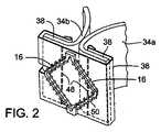 図1および2を参照すると、弁尖アセンブリ14の流出端部分は、弁尖34a、34b、34cの3つの角度離間した交連付着において、ステント12の上部部分に固定することができる。図2に最もよく示すように、各交連付着は、2つの弁尖の交連において、補強区画36を隣接する上部縁部分38に巻きつけ、かつ縫合糸48を用いて、補強区画36を縁部分38に固定することによって、形成することができる。次いで、補強材料および弁尖の挟持された層は、ステントの流出端部に隣接する縫合糸50を用いて、ステント12の支柱16に固定することができる。したがって、弁尖は、望ましくは、流入端部26から流出端部27まで、ステントの全長または実質的に全長に延在する。補強区画36は、縫合糸線における応力集中を最小化し、使用中に屈曲する弁尖の部分上の「針穴」を回避するように、ステントへの弁尖の付着を補強する。補強区画36、スカート42、および内側補強ストリップ46は、望ましくは、ポリテトラフルオロエチレン(PTFE)等の生体適合性剛性材料、またはポリエステル織物(例えば、ポリエチレンテレフタレート(PET))等の織布材料から作製される。  With reference to FIGS. 1 and 2, the outflow end portion of the