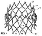 図3および4は、図示目的のために、弁尖区画14のないステント12を示す。示すように、ステント12は、複数の縦方向に延在する、一般的に正弦波形状の枠部材、または支柱16から形成することができる。支柱16は、交番する曲げによって形成され、かつメッシュ構造を形成するように隣接湾曲部の頂点から形成された節部18において溶接されるか、またはさもなければ、相互に固定される。支柱16は、弁が送達装置(下記に説明するもの等)のために、減少された直径まで圧縮されることを可能にし、次いで、送達装置から配備した時に、弁を患者の体内でその機能的寸法まで拡張させる、ニチノールとして公知のニッケルチタン合金等の好適な形状記憶材料から作製することができる。弁が送達装置の膨張可能なバルーン上に圧着され、バルーンの膨張によって、その機能的寸法まで拡張するように適合される、バルーン拡張可能な弁である場合には、ステント12は、ステンレス網等の好適な延性材料から作製することができる。  3 and 4 show a