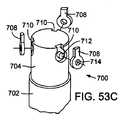 図53A〜53Eは、別の実施形態に従う、送達装置700を図示する。送達装置700は、外側カテーテルシャフト702と、外側シャフトを通って延在する内側カテーテルシャフト704とを備える。外側シャフト702の遠位端部分は、人工ステント弁706(概略的に示す)の上を延在し、患者の血管系を通して送達中に、それを圧縮状態に維持する、シースを備える。内側シャフト704の遠位端部分は、弁706のステントから延在して、弁と送達装置との間の解放可能な接続を形成する、1つ以上の嵌合延長アーム、または柱708と協働するように成形される。例えば、図示した実施形態においては、各柱708は、円環部分で終端する、直線部分を備え、シャフト704の遠位端部分は、各柱708を受容する、対応して成形された凹部710を有する。各凹部710は、各柱708の開口部714内に延在するように成形される、半径方向に延在する突出部712を含むことができる。図53Bに最もよく示すように、各凹部710および突出部712は、柱708の表面と凹部内の隣接する表面との間に小さい間隙を提供して、半径方向(すなわち、シャフト704の軸に垂直)に凹部から柱の挿入および除去を促進するように、寸法決定することができる。  53A-53E illustrate a