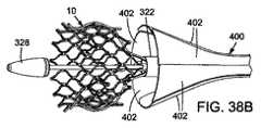 あるいは、フラップ部分402は、ニチノール等の形状記憶材料から作製することができ、かつ自己拡張型である。自己拡張型フラップ部分は、通常、図38A〜38Bに示す拡張構造を取る。フラップ部分402は、外側シース406によって、半径方向に圧縮された状態に保持することができる(図38A)。シース406が、フラップ部分402に対して矢印408の方向に後退させられる時に、フラップ部分402は、図38A〜38Bに示す拡張構造に拡張する。  Alternatively, the