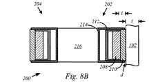 図8Aは記載される実施形態に従う磁気取り付け特徴部202、204の横断面図を示す。この特定の説明では、磁気取り付け特徴部202、204は、略平坦な面を有する筐体102の一部に磁気で取り付けられる。しかしながら、筐体102は曲面を有してもよく、この場合に、以下に記載される磁気取り付け特徴部202、204の様々なコンポーネントの形状は、筐体102の形状に一致する形状を取りうることが留意されるべきである。このようにして、筐体102内の対応する磁気素子と磁気取り付け特徴部202、204との間の分離距離が最小化され、それによって正味磁気引力が最大化される。  FIG. 8A shows a cross-sectional view of magnetic attachment features 202, 204 in accordance with the described embodiments. In this particular description, the magnetic attachment features 202, 204 are magnetically attached to a portion of the