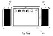 1つの実施形態では、磁気取り付けユニットは、第1電子デバイスと第2電子デバイスとの間で情報を渡しうる。1つの実施形態では、情報は磁気取り付けユニットから提供され、第1電子デバイス及び第2電子デバイスの一方又は両方へ渡されうる。例えば、1つの実施形態では、磁気取り付けユニットは、電子書籍の形態の第1電子デバイス及び第2電子デバイスを取り付けるために用いられうる磁気バインダの形態を取りうる。このようなものとして、少なくとも1つの電子デバイスは、提示される視覚コンテンツに適したディスプレイを有しうる。書籍コンテンツのような情報は、磁気バインダから電子デバイスへ渡されうる。当該情報により、電子デバイスは情報に整合するように動作しうる。 In one embodiment, the magnetic attachment unit may pass information between the first electronic device and the second electronic device. In one embodiment, information may be provided from a magnetic mounting unit and passed to one or both of the first electronic device and the second electronic device. For example, in one embodiment, the magnetic attachment unit may take the form of a magnetic binder that may be used to attach a first electronic device and a second electronic device in the form of an electronic book. As such, the at least one electronic device may have a display suitable for the visual content presented. Information such as book content can be passed from the magnetic binder to the electronic device. With this information, the electronic device can operate to match the information.