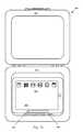 装置300は各タブレットデバイス302、304が本のように視覚情報を提示できる本として参照されうる。例えば、図9に示されるように、開いた形態では、装置300は、タブレットデバイス302のディスプレイ320が開いた本のページのように機能できる(タブレット304のディスプレイ322も同様に機能できる)開いた本に似ている。1つの実施形態では、例えば左から右へのページフリップジェスチャを用いて前方へフリップするようにタブレットデバイス302(又はタブレットデバイス304)のタッチセンサ面を単にスワイプするだけで、ユーザはページを「フリップ」できる。一方、ページ(又はページ群)を後方にフリップするために、ユーザは例えば右から左へのページフリップジェスチャを用いてタブレットデバイス302又は304のタッチセンサ面をスワイプできる。  The
