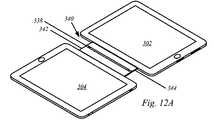 図12Aは磁気取り付けユニット340を介して共に接続されたタブレットデバイス302、304を示す。示されるように、磁気取り付けユニット340はヒンジアセンブリ318を含まず、よってタブレットデバイス302、304に固定して取り付けられる。磁気取り付けユニット340は、クラッチバレル又はヒンジ338を介して互いに旋回可能に接続された剛性接続部材342を含みうる。このようにして、図12Bに示されるように、タブレットデバイス302はテーブルのような平坦な支持面に置かれ、(タブレット304のような)別の電子デバイスはディスプレイとして機能するように配置されうる。図12B及び図12Cから見て取れるように、タブレットデバイス304は、必ずしもタブレットデバイスではない電子デバイス100によって置き換わりうる。例えば、電子デバイス100は、磁気取り付けユニット340に磁気で取り付けることができる単なるディスプレイの形態をとりうる。1つの実施形態では、磁気取り付けユニット340は実際に電子デバイス100の一部として形成されうる。このようにして、磁気取り付けユニット340はタブレットデバイス302に磁気で取り付けるのに適した単一の磁気取り付け特徴部だけを含みうる。  FIG. 12A shows