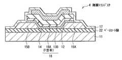 薄膜トランジスタ4は、上記第2の実施の形態の薄膜トランジスタ3と同様、トップゲート型のTFTであり、チャネルに酸化物半導体を用いたものである。また、薄膜トランジスタ4は、基板11上に、ベースコート膜22、ソース・ドレイン電極15A,15B、酸化物半導体層14、ゲート絶縁膜18およびゲート電極12がこの順に形成されたものである。ゲート絶縁膜18は、例えば、酸化物半導体層14の側から順に第1絶縁層18Aおよび第2絶縁層13Bが積層した2層膜よりなる。これらの第1絶縁層18Aおよび第2絶縁層13Bはそれぞれ、シリコン酸化膜、シリコン窒化膜、シリコン窒化酸化膜または酸化アルミニウム膜よりなる。ここでは、第1絶縁層18Aが例えばシリコン酸化膜、第2絶縁層13Bが例えばシリコン窒化膜によりそれぞれ構成されている。  The thin film transistor 4 is a top gate type TFT like the thin film transistor 3 of the second embodiment, and uses an oxide semiconductor for the channel. The thin film transistor 4 includes a base coat film 22, source /