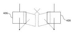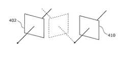 その他の効果を、図5a、図5b、および図5cを用いて説明する。特許文献4における方法は、図5aに左画像402および右画像404として示される、位置合わせ前のカメラ及び画像の向きを、図5bに平行化済み左画像406および平行化済み右画像408として示されるような向きとする位置合わせ(平行化)を実現することを目的としている。ここではエピポールが無限遠にマッピングされ、エピポーラ線が水平軸と平行になっている。一方、本発明は、これを実現することを目的としていない。その代わりに、本発明は図5cにおいて示す位置合わせを実現することを目的としている。ここでは、垂直視差が最小限となり、アスペクト比および視域の直交性が保持される(詳細は、実施形態において説明する)。右画像404は、右画像410によって示されているように、変換(変形)される。本発明は、左画像及び右画像の両方ではなく、いずれか一方の画像変換を行う。したがって、本発明は、特許文献4における先行技術よりも複雑性が低い(処理が簡単である)ため、処理時間を短縮できるという効果を有する。  Other effects will be described with reference to FIGS. 5a, 5b, and 5c. The method in U.S. Patent No. 6,057,051 shows the camera and image orientation prior to alignment, shown as