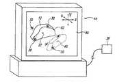 画像データはまた、ターゲット12内の、又はその周わりの各マーカー30の位置を定める。コンピュータ制御装置38は、画像データを使用して、ターゲット、マーカー及びターゲットアイソセンタの模擬モデルを作る。この模擬モデルは、図11に仮想線で示すように、フィードバック部分80に表示される。この模擬モデルはまた、模擬ターゲットアイソセンタ40がマシンアイソセンタと一致するように、マシンアイソセンタ22を重ねて表示される。模擬ターゲット及び模擬マーカーはまた、特定の放射線療法を、ターゲットに適用するために、実際のターゲットをどのように三次元的に位置決めし、且つ配向しなければならないかを表示する。A monitoring