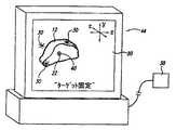 磁界の強度は、励磁源からの距離の三乗に比例する割合で減少することが知られている。したがって、センサからのマーカーの距離を、マーカーの信号強度に基づいて決定することができる。マーカーから、互いに既知の位置に隔てられた一連のセンサまでの幾何学的な関係は、一つの特有の解で一連の方程式を解くのに使用される。したがって、マーカー30とセンサ36との間の距離は、それぞれのセンサーによって測定されたマーカーの信号強度に基づいて、コンピュータ制御装置38によって計算され、幾何学上の方程式に対する最も適当な解を求めて繰り返される。  It is known that the strength of the magnetic field decreases at a rate proportional to the cube of the distance from the excitation source. Therefore, the distance of the marker from the sensor can be determined based on the signal strength of the marker. The geometric relationship from the marker to a series of sensors separated from each other at a known position is used to solve a series of equations with one unique solution. Thus, the distance between the