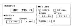 また、就寝者としても、覚醒したが離床につながらず直ぐに睡眠に遷移することも多い。しかし、利用者が訪問することで、覚醒状態が長く続いてしまい、逆に睡眠を妨げてしまうと行った問題点が生じていた。 Moreover, even as a sleeper, it is often awakened, but it does not connect to a bed and changes to sleep immediately. However, when a user visits, the awakening state continues for a long time, and conversely, the problem that was caused when sleep is disturbed has occurred.