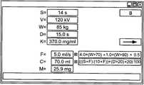 図2は、可能な入力、式および結果に関する第1の例を示す。ここで使用される画面は、入力ユニットにおける入力と照会によりCT装置から取り出された設定パラメータとの表示用と同時に、出力ユニットの表示用としても使用されている。この例では流量Fは手動で書き込まれ、5.5ml/sに決定された。これらのパラメータに対して必要な造影剤量Cが、本発明による装置内に記憶された式から算出される。この例では造影剤量Cは流量を乗算されたスキャン時間Sから算出されるが、しかし最小量10×Fが必要とされ、付加的にテストボーラスの遅れ時間Dが20sより大きい場合には、その量が20mlだけ高められる。限界条件として100mlを上回る造影剤が使用されないことが要求される。操作者は、入力値が自動的に照会によりCT装置から取り出されない場合に限り、該当入力値を入力する。計算キーBを押すことによって同じ表示面に結果が出力される。計算に使用される式が、この例および次の例では、同様に画面上に表示される。その量Mはこの例では24.8mgである。 FIG. 2 shows a first example regarding possible inputs, expressions and results. The screen used here is used not only for displaying the input in the input unit and the setting parameter retrieved from the CT apparatus by the inquiry, but also for displaying the output unit. In this example, the flow rate F was manually written and determined to be 5.5 ml / s. The required contrast medium amount C for these parameters is calculated from the formula stored in the device according to the invention. In this example, the contrast agent amount C is calculated from the scan time S multiplied by the flow rate, but a minimum amount of 10 × F is required, and additionally if the test bolus delay time D is greater than 20 s, The amount is increased by 20 ml. As a limit condition, it is required that no contrast medium exceeding 100 ml is used. The operator inputs the corresponding input value only when the input value is not automatically retrieved from the CT apparatus by inquiry. Pressing the calculation key B outputs the result on the same display surface. The formula used for the calculation is displayed on the screen as well in this and the following examples. The amount M is 24.8 mg in this example.