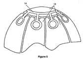 他の解決法は、2つのダンピング要素13の間の局所的な連結を個々に行う複数の個別連結部品を使用することである。周囲に複数の側部、前部および後部ダンピング要素が角度を付けて配設されている頂部ダンピング要素によってダンピングライナーが形成されている場合、各連結部品は、頂部ダンピング要素と周囲のダンピング要素との間の連結を行う。図4においては、各連結部品は、布地、またはVelcro(登録商標)タイプの自己グリップ材料から作製されたバンドを閉じることにより形成されたループ15の形状となっている。ループ15の一方の端部は、頂部ダンピング要素内に配設された通路開口部を貫通し、他方の端部は、これに結合された周囲のダンピング要素の通路開口部を貫通している。他方、図6においては、各連結部品は、軸方向にオフセットされた2つの部分の間のインサート16によって形成されている。各部品は、頂部ダンピング要素または周囲のダンピング要素と協働するように構成され、この目的のために、モミの木の形状の複数の非戻りタブ(anti-return tab)を有している。  Another solution is to use a plurality of individual connecting parts that make local connections between the two