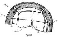 支持ベルトと頭部との間の接触のレベルの快適さを改善する他の実施の形態においては、シェル12に取り付けられた支持ベルトを構成するダンピング要素の面の反対側の面に、圧縮要素17が配設され得る。このような圧縮要素17は、支持ベルトの周長の全体または一部を覆うことができ、強固な軟質発砲体、例えばエチレン酢酸ビニルから作製され、支持ベルトのダンピング要素が製造される際に付設される、または設けられる。このような圧縮要素17は、補完ベルトを作り出す機能を有し、圧縮要素17の変形によって、所望の頭部周長のために提供されたヘルメットの内側に、より大きな周長を有する頭部が位置付けられることを可能にする。  In another embodiment that improves the comfort of the level of contact between the support belt and the head, the compression element is placed on the surface opposite the surface of the damping element that constitutes the support belt attached to the