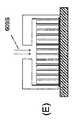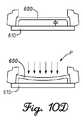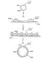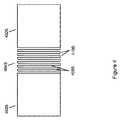 本発明で利用されうる可撓性かつ伸張性の電子部品技術に戻って、GaAsまたはシリコンなどの半導体の座屈した波形のリボンは、エラストマー基板上の電子部品の一部として作製されてもよいことが示された。サブミクロン範囲の厚さならびに明確な「波形(wavy)」および/または「座屈した(buckled)」幾何形状などを有する半導体リボンが立証された。エラストマー基板の表面上のまたはその基板に埋め込まれた、結果として得られる構造は、10%より大きな歪みに対して可逆的な伸張性および圧縮性を示すことが示された。これらの構造化GaAsリボン上にオーム接触を集積させることによって、高性能伸張性電子デバイスが達成される。第’292号特許は、PDMSで作られたエラストマー基板上に伸張性GaAsリボンを作製するステップを示し、リボンは、複数のエピタキシャル層を有するGaAsの高品質バルクウェハから生成される(図22を参照)。解放されたGaAsリボンを有するウェハは、リボンが伸張方向に沿って整列した状態で伸張前のPDMSの表面に接触する。母体ウェハからPDMSを剥離することで、全てのリボンがPDMSの表面に転写される。PDMS内の予備歪みを緩和することで、リボンに沿って大規模な座屈/波形構造が形成される。リボンの幾何形状は、スタンプに加えられる予備歪み、PDMSとリボンとの間の相互作用、およびリボンの曲げ剛性などに依存しうる。所定の実施形態では、座屈および波は、たとえばデバイス構造に関連する厚さ変動のために、単一リボン内に、その長さに沿って含まれてもよい。実用的な用途では、リボンおよびデバイスを、それらの伸張性を維持するように被覆することが有用である場合がある。エラストマー基板上の半導体リボンは、高性能電子デバイス、半導体多層積重体の座屈した波形リボン、およびかなりの圧縮性/伸張性を示すデバイスを作製するために使用されてもよい。所定の実施形態では、本発明は、伸張性波形相互接続を有するCMOSインバータのアレイなどの半導体リボンを利用するデバイスのアレイを生産する作製プロセスを利用してもよい。同様に、上部層被覆の方策は、回路要素を歪みから隔離し、それにより、クラッキングを回避するために使用されてもよい。 Returning to the flexible and extensible electronic component technology that can be utilized in the present invention, a semiconductor buckled corrugated ribbon such as GaAs or silicon may be fabricated as part of an electronic component on an elastomeric substrate. It was shown that. Semiconductor ribbons with submicron range thickness and distinct “wavy” and / or “buckled” geometries have been demonstrated. The resulting structure on or embedded in the surface of the elastomeric substrate has been shown to exhibit reversible extensibility and compressibility for strains greater than 10%. By integrating ohmic contacts on these structured GaAs ribbons, high performance extensible electronic devices are achieved. The '292 patent shows the steps of making an extensible GaAs ribbon on an elastomeric substrate made of PDMS, the ribbon being produced from a high quality bulk wafer of GaAs with multiple epitaxial layers (see FIG. 22). ). The wafer with the released GaAs ribbon contacts the surface of the PDMS before stretching with the ribbon aligned along the stretching direction. By peeling the PDMS from the base wafer, all ribbons are transferred to the surface of the PDMS. By mitigating pre-strain in the PDMS, a large buckling / corrugated structure is formed along the ribbon. Ribbon geometry may depend on pre-strain applied to the stamp, interaction between the PDMS and the ribbon, and the bending stiffness of the ribbon. In certain embodiments, buckling and waves may be included along their length within a single ribbon, eg, due to thickness variations associated with the device structure. In practical applications, it may be useful to coat ribbons and devices so as to maintain their extensibility. Semiconductor ribbons on elastomeric substrates may be used to make high performance electronic devices, buckled corrugated ribbons of semiconductor multilayer stacks, and devices that exhibit significant compressibility / extension. In certain embodiments, the present invention may utilize a fabrication process that produces an array of devices that utilize a semiconductor ribbon, such as an array of CMOS inverters having extensible waveform interconnects. Similarly, top layer coating strategies may be used to isolate circuit elements from distortion and thereby avoid cracking.