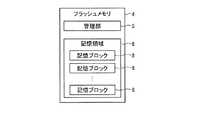 図1および図2に示すように、フラッシュメモリ4は、複数の記憶ブロック8,・・・(図2)が設けられた記憶領域6と、この記憶領域6に対する更新作業などを管理・制御する管理部5とを有する。なお、ここでいうフラッシュメモリ4は、記憶媒体のみでなく、外部からの指示に基づいて、記憶媒体に対する単純な書き込みや読み出しといった制御を行うメモリ制御機能も含んでいる。つまり、管理部5もメモリ制御部の一例となりうる。  As shown in FIGS. 1 and 2, the flash memory 4 manages and controls a