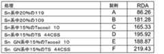 図2では、様々な種類の溶融シリカ及び沈殿シリカの、スズ適合性、並びにフッ化物適合性を示す。スズ適合性、及びフッ化物適合性は、グルコン酸ナトリウム0.6%及びフッ化第一スズ0.454%を含有する、ソルビトール/水混合物中に、シリカを15%加え、十分に混合することによって測定した。次に、各シリカスラリーのサンプルを、40℃で14日間安置し、次いでスズ及びフッ化物について分析した。通常の歯磨き条件下での、可溶性スズ及び可溶性亜鉛の濃度の測定は次の通りとすることができる。3:1の、水と歯磨剤(シリカ)とのスラリーを調製し、遠心分離器で上澄みの透明層を分離する。上澄みを酸溶液(硝酸、又は塩酸)で希釈し、誘電結合プラズマ発光分光分析法によって分析する。初期値から分析値を差し引くことにより、パーセント適合性を算出する。通常の歯磨き条件下での、可溶性フッ化物の濃度の測定は次の通りとすることができる。3:1の、水と歯磨剤(シリカ)とのスラリーを調製し、遠心分離器で上澄みの透明層を分離する。フッ化物電極によって(TISAB緩衝剤と1:1で混合した後)、又は水酸化物溶液で希釈し、導電率検出を用いたイオンクロマトグラフィーによる分析によって、上澄みをフッ化物に関して分析する。初期値から分析値を差し引くことにより、パーセント適合性を算出する。一般的には、カチオン適合性は、米国特許第7,255,852号に開示の「% CPC適合性試験」によって測定することができる。 FIG. 2 shows the tin compatibility and fluoride compatibility of various types of fused silica and precipitated silica. For tin compatibility and fluoride compatibility, add 15% silica in a sorbitol / water mixture containing 0.6% sodium gluconate and 0.454% stannous fluoride and mix well. Measured by. Each silica slurry sample was then placed at 40 ° C. for 14 days and then analyzed for tin and fluoride. Measurement of soluble tin and soluble zinc concentrations under normal toothpaste conditions can be as follows. A 3: 1 water and dentifrice (silica) slurry is prepared and the supernatant clear layer is separated in a centrifuge. The supernatant is diluted with an acid solution (nitric acid or hydrochloric acid) and analyzed by dielectric coupled plasma emission spectroscopy. Percent suitability is calculated by subtracting the analytical value from the initial value. Measurement of the concentration of soluble fluoride under normal tooth brushing conditions can be as follows. A 3: 1 water and dentifrice (silica) slurry is prepared and the supernatant clear layer is separated in a centrifuge. The supernatant is analyzed for fluoride by fluoride electrode (after mixing 1: 1 with TISAB buffer) or by dilution with hydroxide solution and analysis by ion chromatography with conductivity detection. Percent suitability is calculated by subtracting the analytical value from the initial value. In general, cation compatibility can be measured by the “% CPC compatibility test” disclosed in US Pat. No. 7,255,852.