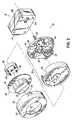 図2は、ユーザ入力デバイス15及びその内容物を示す分解図である。ダイヤル24は、ユーザによって手で把持される突出部分30と、その背面に数字の組合せの数字34(図3参照)を有する平面部分32と、を有する。真鍮のインサート36は、ネジ固定具38を用いてダイヤル24に強固に固定されている。真鍮のインサート36は、ダイヤル24に重量を付与し、ダイヤル筐体16の部分40に対して回転するための支持部材を提供する。ダイヤル筐体16は、ダイヤル平面部分40の背面にある数字をミラー28の反射を介して視認することを可能とするための窓部42、44を有する。LED表示発光部46は、組合せの入力の表示をもたらすためにさまざまな方法で設けられ、使用されてもよい。標準的な9ボルトのバッテリのようなバッテリ48は、バッテリドア50を通してダイヤル筐体16内に取り外し可能に配置されており、後述する電気回路及びサーボモータに電力を供給する。回転軸シャフト52は、正確な組合せコードを入力すると、ダイヤル24の回転をボルト後退ハードウエアに伝達するために設けられている。  FIG. 2 is an exploded view showing the