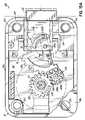 図8Aから図8C及び図9Aから図9Cと共に図6及び図7を参照して、ボルトの後退手順を説明する。エンコーダ及びコントローラによって認識されるように正確な組合せコードを入力すると、アクチュエータ70は、作動され、その出力素子76は、回転する。出力素子76は、ピン76aを有し、このピンは、回動ブロック72(図5)にあるスロット86を通って回転しかつボルト後退ギア68にあるスロット68cを通って移動する。通常、このピン76aは、例えば図8Aに示すように、ボルト後退ギア68の回転を防止する。しかしながら、図8Aから図8Cに示すように、アクチュエータ70の出力素子76が回転してピン76aを下方に移動させると、これは、ボルト後退ギア68が図8Aから図8Cに示すように時計回りに移動または回転することを可能とし、それは、駆動ギア素子80の第2部分80bと係合する。図示されていないが、ボルト後退ギア68は、例えばバネ力が小さいトーションバネによって若干バネ付勢されており、ボルト後退ギア68は、アクチュエータ70が作動するまで図8Bに示す位置まで時計回り方向に付勢する。いったんギア68、80bを図8Bに示すように係合すると、ダイヤル24は、手動で回転され、駆動ギア素子80は、軸ギア78との第1駆動ギア部分80aの係合を介して回転される。図8Aから図8Cに示すように、軸ギア78は、キー88によってシャフト52に結合されている。図8Bに示すように、ボルト後退ギア68を駆動ギア部分80bと係合すると、ボルト後退ギア68は、その回動軸68a回りで回転し、ボルト後退ギア68に固定されたピン68bは、ボルト案内部材64の凹所64aとボルト案内部材64の湾曲スロットまたはピンガイド90の端部90a(図5)とに載置される位置から出て上昇する。また、ピン68bは、ボルト54にあるスロット54aを通って延出し、ボルト後退ギア68が回転するにしたがって、ピン68bは、図8B及び図8Cに示すように、スロット54a内を上方向けて上昇し、同時に、ボルト54をロック筐体14内へボルト案内部材64を通って移動させる。ダイヤル24、シャフト52及びギア78、80、68を逆方向に回転させることにより、ボルト54をその完全に延出した位置まで延在させ、ボルト後退ギア68は、ピン76aによって図8Aに示す初期位置まで復帰される。その際、出力素子76は、バネ92を用いてバネ付勢されており、アクチュエータ70を作動停止すると、バネ92は、ピン76aを図9Aに示す初期位置まで復帰させ、出力素子76のバネ力は、ボルト後退ギア68を図8Aに示す初期位置まで復帰させるのに十分に強力である。  With reference to FIG. 6 and FIG. 7 together with FIG. 8A to FIG. 8C and FIG. 9A to FIG. Upon entering the correct combination code as recognized by the encoder and controller, the