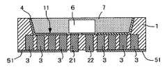 柱状ヒートシンク3は、その両端が支持基板1の厚み方向に貫通し、互いに微小間隔を隔てて、マトリクス状に多数配置されている。柱状ヒートシンク3は、図において、貫通電極21の側に属する一群と、貫通電極22の側に属する一群とに分かれている。貫通電極21の側に属する一群は、支持基板1の裏面(他面)に設けられた放熱体51によって共通に接続され、貫通電極22の側に属する他の一群は、支持基板1の裏面に設けられた別の放熱体52によって共通に接続されている。貫通電極21、22のリード電極は、放熱体51、52から独立させてある。この構造によれば、貫通電極21,22及び凹部11の周りには、柱状ヒートシンク3の群による放熱路を形成し、発光素子6及び貫通電極21,22からの熱を、柱状ヒートシンク3の群によって集め、その熱を、支持基板1の厚み方向に伝達し、支持基板1の他面に設けられた放熱体51、52から、支持基板1の面に沿って外部に拡散し、放出することができる。即ち、3次元的放熱経路が構成される。このため、放熱特性が向上する。A large number of