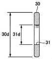 図4は、本発明の実施形態のブラインドリベットに使用するワッシャ30の断面図である。ワッシャ30は、中心部分に軸方向に断面が円形の中心孔31が開いた円板状の部材である。中心孔31の内径31dは、マンドレル20の頭部23の外径23dより少し大きく、スリーブ11の外径11dより少し大きく、マンドレル20とリベットボディ10を組み合わせたブラインドリベットに、マンドレル20の頭部23の側から、ワッシャ30をスリーブ11の外周に挿入することができる。中心孔31の内径31dは、ワッシャ30をスリーブ11との間に隙間があき、スリーブ11の外側で移動できる大きさである。ワッシャ30の外径は30dである。  FIG. 4 is a cross-sectional view of the