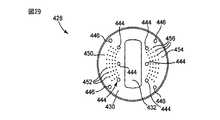 噴出し性能に加えて、分配アセンブリ100は、1つ以上の処理流体をシャワーヘッドの形式で、半製品18に向けて概して下側にむけて分配する更なる分配性能を盛り込んでいる。この取り組みは、特に、1つ以上の気体および/または蒸気の一様な流れを処理室16に分配するために好適である。好ましい実施形態においては、このキャピラリは、シャワーヘッド分配部材426のような分配構造により設けられている。シャワーヘッドスペーサ382および孤立した支持体380は、シャワーヘッド分配部材426を備え付けおよび支持することに役立つ。説明のために、シャワーヘッド分配部材426は、全く同じでありまたは独立していても良い2つの供給装置により供給され、このように、2つの異なる処理材料が同時に処理室16に分配されることを許容する。当然ながら他の実施形態は、所望により、単一の供給装置または3つまたはそれ以上の装置を含んでいても良い。  In addition to spout performance, the dispensing