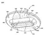 底部材428の床板430は、中央穴432の一方の側の第1領域450と、中央穴432の他方の側に配置されている第2領域454と含む。第1領域450は、ノズル開口452の配列を含み、第2領域454は、第2のノズル開口456の配列を含む。  The