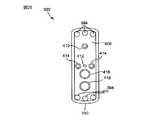 床面408は、シャワーヘッドスペーサ382を隔壁板102に固定するために、ねじ138が隆起した突起134のねじ穴136に係合し得る様に、穴410を含む。床面408は、以下に更に記述される中央の分配構成部品を固定するための穴412を含む。穴414は、中央の分配構成部品に導かれる導管を供給することを許容する。穴416および418は、それぞれが流体入口部材216および240の上側に適合する。Oリング(図示せず)は、シャワーヘッドスペーサ382とスプレー棒178との間、およびシャワーヘッドスペーサ382と隔壁板102との間の空洞419の中に適合する。  The