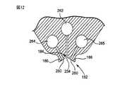処理材料をスプレー棒178のノズル機構に供給するために、供給管222および246は、そのような材料を流体入口部材216および流体入口部材240に搬送する。流体入口部材216は、溝182の頂部184における、ノズル配列234に処理材料を搬送する流体通路の一部分である。流路262は、流体入口部材216とノズル配列234との間の流体の通路の一部分である。流体入口部材216は、ねじ切りされた基材218(ねじは図示されず)およびフレア接続220を含む。供給管222は、固定ナット224によりフレア接続220に固定されている。流体入口部材240は、溝182の表面186に設けられているノズル配列260に処理材料を搬送する流体通路の一部分である。流路264および265は、流体入口部材240とノズル配列260との間の流体通路の一部分である。栓238および236は、流路262、264および265の端部に挿入されている。