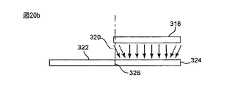 しかしながら、現在では、下に配置される半製品における噴出しの足跡は、予期されているものよりも小さくなることが観察されている。特に、液体がスプレー棒178のような噴き出し機構を用いて、気体とともに霧化されるときに、半製品の上の噴出しの足跡は、噴き出された材料が分配されているノズル配列の区間よりも小さくなる。このように、もしも、ノズル開口の足跡が、単に半製品の中心から外周に及んでいるときには、その結果の噴出しは、回転速度、排気流速、スプレー棒の半製品からの高さ、およびそれらの組合せに依存して、実際に効果的に中心または外周に到達しないであろう。分配された気体の高い速度は、ベルヌーイ効果のためにより低い圧力領域を発達させ、これにより噴出しが半製品に向かって移動するときに噴出しが内側に向かって傾斜する。噴出しの端部における噴出し配列の部分は、図20bおよび図20cに示されるように、内側に向かって引きずり込まれる。図20a−図20cは、半製品312、322および332のそれぞれに関して、噴出し310、320および330の軌跡をそれぞれ説明する。半製品18のように、半製品312、322および332は、典型的には、半導体ウエハまたは他のマイクロエレクトロニクス基板である。  However, it has now been observed that the footprint of eruption in the underlying semi-finished product is smaller than expected. In particular, when liquid is atomized with gas using a spray mechanism such as