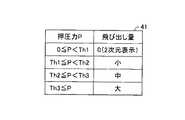 図3は、押圧力に関する閾値を示したデータテーブル41を説明するための図である。図3を参照して、データテーブル41は、押圧力Pが0以上閾値Th1未満のときには飛び出し量が0となるように、押圧力Pと飛び出し量との関係を規定している。つまり、データテーブル41においては、ユーザがタッチパッド110に指を接触していない、あるいは軽く触れているだけのときには、2次元表示がなされるように、押圧力Pと飛び出し量との関係が規定されている。 FIG. 3 is a diagram for explaining the data table 41 indicating threshold values related to the pressing force. Referring to FIG. 3, the data table 41 defines the relationship between the pressing force P and the popping amount so that the popping amount becomes zero when the pressing force P is 0 or more and less than the threshold Th1. That is, in the data table 41, when the user does not touch the