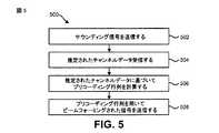 図5は、明示的なチャンネルサウンディングを用いてビームフォーミングされた信号を送信するための方法500のある一つの構成を例示しているフロー図である。502で基地局326は一つ以上のサウンディング信号342(例えば、トレーニングパケット)を一台以上の無線通信装置346に送信する。一台以上の無線通信装置346はそれぞれが一つ以上のサウンディング信号342を用いて推定されたチャンネルデータ350を計算して当該データ350を基地局326に送信する。基地局326は推定されたチャンネルデータ350を504で受信する。推定されたチャンネルデータ350は推定されたチャンネルの数値表現である。すなわち基地局326は、個々の無線通信装置346から異なる推定されたチャンネルデータ350を受信する。506で基地局326は、推定されたチャンネルデータ350に基づいてプリコーディング行列310を計算する。次に508で基地局326は、プリコーディング行列310を用いてビームフォーミングされた(例えば、SDMA)信号(例えば、データ)を送信する。  FIG. 5 is a flow diagram illustrating one configuration of a