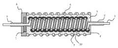 図5に示すように、柱状の高分子アクチュエータ1は、中心部にコイル型のバネ状構造を有し、両端部は直線状の構造を有する、プラスチック製の絶縁体基材1を有している。コイル型のバネ構造は、直線状の構造を被覆した端子2からの電圧を印加できるように導電性材料9がその表面に配置され、導電性を有するように構成されている。線材の間の空間が高分子材料10により埋められて、アクチュエータ電極4と絶縁性基材1とが複合化されている。すなわち、導電性材料と高分子材料とによって形成されるアクチュエータ電極4が絶縁性基材に接して構成されている。このアクチュエータ電極4の外周には、上記した実施形態と同様に電解質層5と、更にその外周にアクチュエータ電極6とを有している。  As shown in FIG. 5, the columnar polymer actuator 1 has a plastic insulator base 1 having a coil-type spring-like structure at the center and a linear structure at both ends. Yes. The coil-type spring structure is configured such that a conductive material 9 is disposed on the surface thereof so that a voltage from the