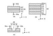 第1電極51及び第2電極52には、例えば、非磁性体であるAu、Cu、Ta、Al等を用いることができる。第1電極51及び第2電極52として、軟磁性体の材料を用いることで、センサ部積層体に影響を及ぼす外部からの磁気ノイズを低減することができる。軟磁性体の材料としては、例えば、パーマロイ(NiFe合金)や珪素鋼(FeSi合金)を用いることができる。センサ部50は、周囲との絶縁性を確保するために、アルミ酸化物(例えばAl2O3)やシリコン酸化物(例えばSiO2)等の絶縁体で覆われる。For the