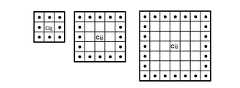 平滑化フィルタ処理がなされたG成分画像に対して、周囲よりも明るい画素領域を検出するため以下のような微分マスク処理を行う。周囲より明るい画素領域を検出する理由は、図3〜図5を参照しながら説明したとおり、偏光照明の偏光方向が被写体の表面溝と平行に近い場合、輝度が周囲よりも明るくなるためである。実際には、被写体の表面凹凸の向きは未知である。しかし、本開示の実施形態では、偏光照明の偏光方向が、直交する2つの方向の間で交互に変わり、(P⊥)と(S⊥)の2種類の直交ニコル画像を交互に取得できるため、問題はない。微分処理は、平滑化処理後の画像に、図17に示すような中心画素と周辺画素とを指定するマスク(ここでは3×3、5×5、7×7画素の例を示す)を設定し、周辺の周囲N=8画素、N=16画素、もしくはN=24画素の画素値Vklの平均値と中心画素値Cijとの差分値Δを算出する。こうして得られる差分値Δは、以下の数1の式で示される。