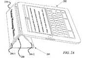 図2Aはカバーディスプレイ206を有するカバー204に取り付けられたタブレットデバイス202の透視図を示す。1つの実施形態では、支持に用いられうる三角形状に折り曲げられたカバー204が示され、これはタブレットデバイス202の仮想キーボードへのタイピングに便利な方向にタブレットデバイス202が配置されることを可能にする。この実施形態では、カバーディスプレイ206は、ラベル206−1で示されるように、カバー204の第1セグメント208を少なくとも覆う。カバーディスプレイ206はまた、ラベル206−2で更に示されるようにカバー204の周りを包みうる。カバーが折り曲げられたことを可撓性カバー204に埋め込まれたセンサ208が判定した場合にカバーディスプレイ206はこの方向に自動的に有効化されうる。別の実施形態では、カバーが閉じたことを判定した後に、タブレットデバイス202に含まれる加速度計は、カバーディスプレイ206を自動的に有効化する前に、タブレットの方向が所定の値の範囲に含まれることを確認しうる。カバーディスプレイ206にアクティブマトリクス式有機発光ダイオード(AMOLED)を用いることによって、スクリーン全体がオン状態かオフ状態となる従来のLCD技術とは反対に、単一画素が発光しうる。従って、AMOLEDスクリーンは少量のテキストを極めて控えめな電力レベルで表示できる。この技術を方向判定センサと組み合わせると、カバーディスプレイ206のうちセグメント210上の部分だけが有効化され、複数の有用な機能を提供しうる。例えば、少数の画素だけが有効である場合に消費される少量の電力はバッテリ寿命を節約するのに役立ちうる。有効化されると、カバーがこの方向に配置された場合にカバーディスプレイ206は複数の有用な機能を実行しうる。1つの実施形態では、ユーザのソーシャルメディアサイト状態が表示されうる。別の実施形態では、文書処理アプリケーションにタイプされた所定の個数の直近の単語が表示されうる。さらに別の実施形態では、ディスプレイは単にタブレットのユーザ名を表示でき、これは会議又は教室のような環境で有用である。  FIG. 2A shows a perspective view of the
