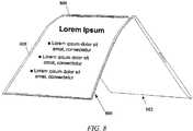 図8は代替の実施形態に従う可撓性カバー804によって支持されるタブレットデバイス802の透視図を示す。この実施形態では、可撓性カバー804は上記の実施形態では存在していた補強材の何れも有しない。その代わりに、可撓性カバー804は、本質的に略剛性であるが変形可能な材料で形成されうる。これは、可撓性カバー804を複数の異なる形状に操作し、その後に更なる操作が望まれるまで形状が維持されることを可能にする。図8は、可撓性カバー804がタブレットデバイス802の重さを支持するのに十分な剛性を有し、可撓性カバー804の1つの縁とタブレットデバイス802の1つの縁が平坦な面に接触する1つの形状に操作された可撓性カバー804を示す。接続部806はまた、互いに一定の相対角度でタブレットデバイス802と可撓性カバー804とを維持するのに十分な剛性を有する必要があることに留意することが重要である。これを実現するための1つの方法は、接続部806のヒンジ部が通常動作中に自由に動くが、図示されるように自立構成においてタブレットデバイス802を支持するために必要な場合に定位置にロックされるようなロック機構を接続部806に追加することである。可撓性カバー804はまた、カバーディスプレイ808を含みうる。カバーディスプレイ808は、カバーディスプレイ808がタブレットディスプレイ(不図示)と等しい機能を有するようにタッチセンサ入力によって実施されるユーザインタフェースを含みうる。これは、複数の有用な用途を可能にする。1つの実施形態では、カバーディスプレイ808は少数の聴衆へのプレゼンテーションプラットフォームとして用いられうる。演説者は、制御部を操作し、タブレットディスプレイ(不図示)の演説者用メモを見るための能力を有するタブレットデバイス802の後ろに立つが、聴衆はカバーディスプレイ808の(図示された)プレゼンテーションを見る。別の実施形態では、2人のユーザは、各ユーザが各ディスプレイを操作してタブレットを同時に使用できる。これは、ロバストな2人プレーのゲームアプリケーションを可能にする。両プレーヤが1つのデバイスにいるので、ネットワーク遅延により生成されるラグが回避されうる。例えば、リアルタイムアクションゲーム及び一人称シューティングゲームは遅いネットワークでプレーするユーザに不公平に不利益となりうる。直接接続又は近距離通信リンクでは、これらのタイプの遅延は実質的に排除されうる。別の実施形態では、2人のユーザは、商用アプリケーションで効率的に協業できる。例えば、各ユーザは独立したビュー及び制御部集合を有しうるので、適切なソフトウェア実装を前提として、単一の文書又はスプレッドシートが同時に効率的に編集されうる。  FIG. 8 shows a perspective view of a