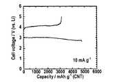 電池の放電は、炭素の重量当りの電流密度10mA/gで、開回路電圧から電池電圧が2.5Vに低下するまで測定を行った。また、充電は、同電流密度で、電池電圧が5Vに増加するまで行った。充放電容量は炭素の重量あたりの値(mAh/g)で表す。