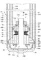 他方、シリンダ13の外筒13Aと内筒13Bの各上端内周はロッドガイド21の頭部21Aの下に設けた中外径部と小外径部のそれぞれに圧入等して固定されている。そして、ダンパチューブ12はロッドガイド21の頭部21Aを挿着され、頭部21Aの上のオイルシール22、オイルシール22の上面に設けたワッシャ22Aよりも上方に突出し、その突出端を加締部12Bとする。ダンパチューブ12は、ボトムキャップ12Aと加締部12Bの間に、ロッドガイド21、オイルシール22、ワッシャ22A、ボトムプレート24、第2のベースピストン60を介して、シリンダ13の外筒13A、内筒13Bを軸方向で挟み込み固定するものになる。  On the other hand, the inner periphery of each upper end of the