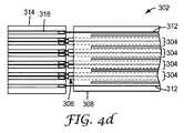 図4a〜4dは、遮蔽電気ケーブル302の、プリント基板又は他の終端構成要素314への代表的な終端プロセスを例示する。この終端プロセスは、マス終端プロセスであってもよく、ストリッピング(図4a〜4d)、位置合わせ(図4cに図示される)、及び終端(図4dに図示されている)の工程を含む。本明細書において示される、及び/又は記載されるケーブルのいずれかの形態を一般的に取り得る、遮蔽電気ケーブル302を形成するとき、遮蔽電気ケーブル302の導体セット304、絶縁導体306、及び接地導体312の構成は、プリント基板314の接点要素316の構成に一致させることができ、これは、位置合わせ及び終端の間の、遮蔽電気ケーブル302の末端部分のいずれか著しい操作を排除する。  4a-4d illustrate an exemplary termination process of shielded