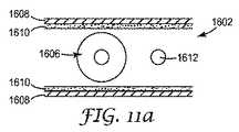 図11aに示される工程において、絶縁導体1606、絶縁導体1606から間隔を置いて配置された接地導体1612、及び2つの遮蔽フィルム1608が提供される。遮蔽フィルム1608はそれぞれ適合性接着層1610を含む。図11b〜11cに図示される工程において、遮蔽フィルム1608は、絶縁導体1606及び接地導体1612の周辺に形成され、互いに結合される。最初は、図11bに示されるように、接着層1610は、その元の厚さを依然として有する。遮蔽フィルム1608の形成及び結合が進むとき、激合成接着層1610は、遮蔽電気ケーブル1602(図11c)の所望の機械及び電気的性能特性を達成するように適合する。  In the process shown in FIG. 11a, an