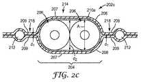 図2cは、ケーブル202の挟まれた領域218における遮蔽フィルム208の挟まれた部分209間に配置され、ケーブル202cのカバー領域214において遮蔽フィルム208のカバー部分207と絶縁導体206との間に配置される、接着層210cを示す。この構成において、接着層210cは、ケーブル202cの挟まれた領域218において遮蔽フィルム208の挟まれた部分209を一緒に結合し、遮蔽フィルム208のカバー部分207を、ケーブル202cのカバー領域214における絶縁導体206に結合する。  FIG. 2c is disposed between the sandwiched
