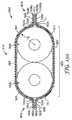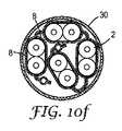 図10cに図示されている工程では、複数の絶縁導体6、接地導体12、及び遮蔽フィルム8が提供される。形成ツール24が提供される。形成ツール24は、遮蔽電気ケーブル2の所望の断面形状に対応する形状を有する一対の形成ロール26a、26bを含み、形成ツールはまたロール間隙28を含む。絶縁導体6、接地導体12、及び遮蔽フィルム8は所望の遮蔽されたケーブル2の構成(例えば本明細書に示され、及び/又は記載される任意のケーブルなど)に従って配置され、その後、それらは形成ロール26a、26bのロール間隙28内に同時に送達されて、形成ロール26a、26bの間に配置される。形成ツール24は、導体セット4及び接地導体12の周辺に遮蔽フィルム8を形成し、遮蔽フィルム8を互いに、各導体セット4及び接地導体12の両側で結合する。結合を促進するために熱が適用されてもよい。この実施形態では、導体セット4及び接地導体12の周辺に遮蔽フィルム8を形成すること、並びに遮蔽フィルム8を互いに、各導体セット4及び接地導体12の両側で結合することは単一操作で生じるが、他の実施形態では、これらの工程は別個の操作で生じる場合がある。  In the process illustrated in FIG. 10c, a plurality of
