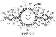 図2a〜2gの断面図は、様々な遮蔽電気ケーブル又はケーブルの部分を表し得る。図2aにおいて、遮蔽電気ケーブル102aは単一の導体セット104を含む。導体セット104は、ケーブルの長さに沿って延在し、単一の絶縁導体106のみを有する。必要に応じて、ケーブル102aは、ケーブル102aの幅にわたって互いに間隔を置いて配置され、ケーブルの長さに沿って延在する複数の導体セット104を含むように作製され得る。2つの遮蔽フィルム108は、ケーブルの対向する側に配置される。ケーブル102aは、カバー領域114及び挟まれた領域118を含む。ケーブル102aのカバー領域114において、遮蔽フィルム108は、導体セット104を被覆するカバー部分107を含む。横断面において、カバー部分107は組み合わせて、導体セット104を実質的に包囲する。ケーブル102aの挟まれた領域118において、遮蔽フィルム108は導体セット104の各側に挟まれた部分109を含む。  The cross-sectional views of FIGS. 2a-2g may represent various shielded electrical cables or portions of cables. In FIG. 2 a, the shielded