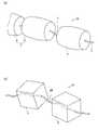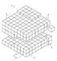 図2は、連結部7を表すために隣合う部分塊5の間を空隙としているが、図1に示すように隣合う部分塊5は密接していても良い。個々の部分塊5は、その厚み方向、幅方向、及び長手方向の一辺の長さをそれぞれ約1〜4cmとした立方体である。部分塊5の一辺の長さは4cmを超えても良く1cm未満であっても良い。部分塊5の形状、及び個数が限定されることはなく、個々の部分塊5が、多面体、球体、又は図4(a),(b)に示すような錐体であっても良い。また、総ての部分塊5のそれぞれの形状、又は寸法が互いに同じである必要はない。In FIG. 2, a gap is formed between adjacent