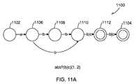 図11Aおよび図11Bは、再入なし条件をさらに説明するために使用できる、オートマトン1100および1114を示す。図11Aは、構文木内の数量化に対応するオートマトン例1100を示し、そこで、コンパイラは、数量化に対応するオートマトンが決定性であるかどうかを判断するために解析できる。  FIGS. 11A and