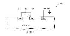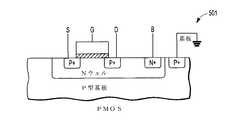 図5、図6、および図7は、それぞれ、PMOSトランジスタ501、分離NMOSトランジスタ601、およびNMOSトランジスタ701の部分断面図を示す。「S」はソース領域コンタクトを表し、「G」はゲートコンタクトを表し、「D」はドレイン領域コンタクトを表し、「B」はボディをバイアスするためのボディコンタクトを表す。これらの図において、基板はVSSにおいてバイアスされている、P型ドーピングされたものである。トランジスタ601は、Pウェル領域を完全に包囲して、その領域を基板(「P型基板」とラベリングされている)から分離している分離Nウェルタブまたは領域(図6において「Nウェル」とラベリングされている)を有し、それによってPウェル領域が基板とは異なる電圧においてバイアスされることが可能となる。ソース領域およびドレイン領域は、MOSFETのための電流電極である。ゲートは、MOSFETのための制御電極である。  5, 6 and 7 show partial cross-sectional views of the