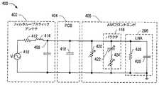 LNA206は、抵抗器426を含んでおり、抵抗器426は、節点408に接続された第1端子と、グラウンドに接続された第2端子とを有している。LNA206は、キャパシタ428をさらに含んでおり、キャパシタ428は、節点408に接続された第1電極と、グラウンドに接続された第2電極とを含んでいる。The AM front-